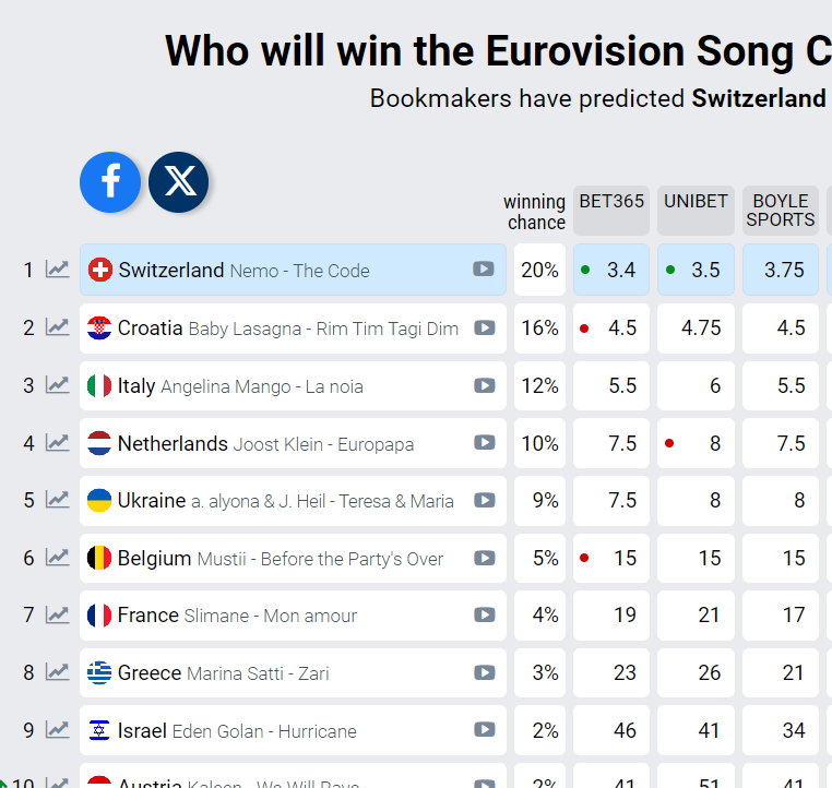 Sudeći prema aktualnim podacima, Švicarska sada ima 20% šanse za osvajanje Eurosonga, dok Baby Lasagna trenutno drži drugo mjesto s 16%. Talijanska predstavnica Angelina nalazi se na trećem mjestu s 12% šanse za pobjedu.