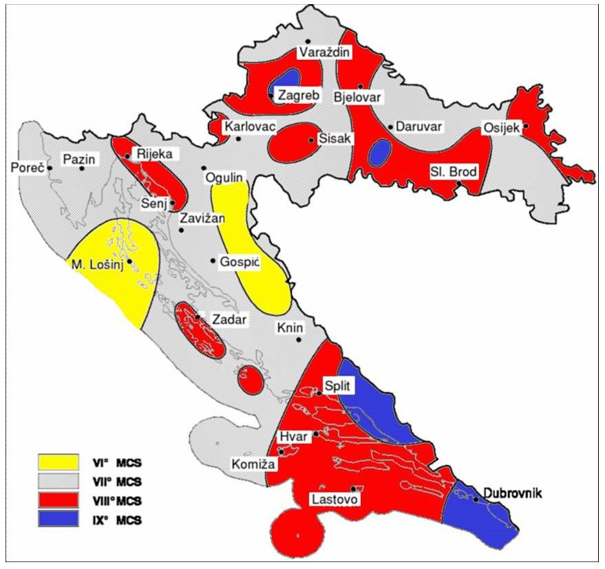 Karta očekivanog intenziteta potresa (po Mercallijevoj ljestvici) u Hrvatskoj