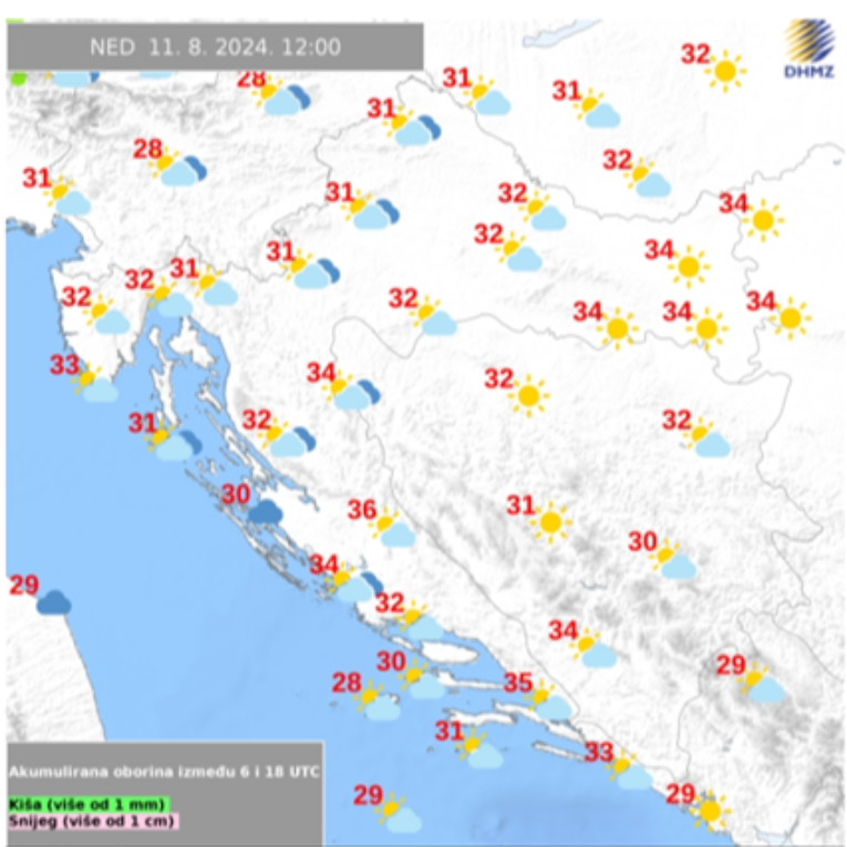 - Temperature: Najviša dnevna temperatura zraka uglavnom između 28 i 33°C, dok će u Dalmaciji doseći i do 35°C.