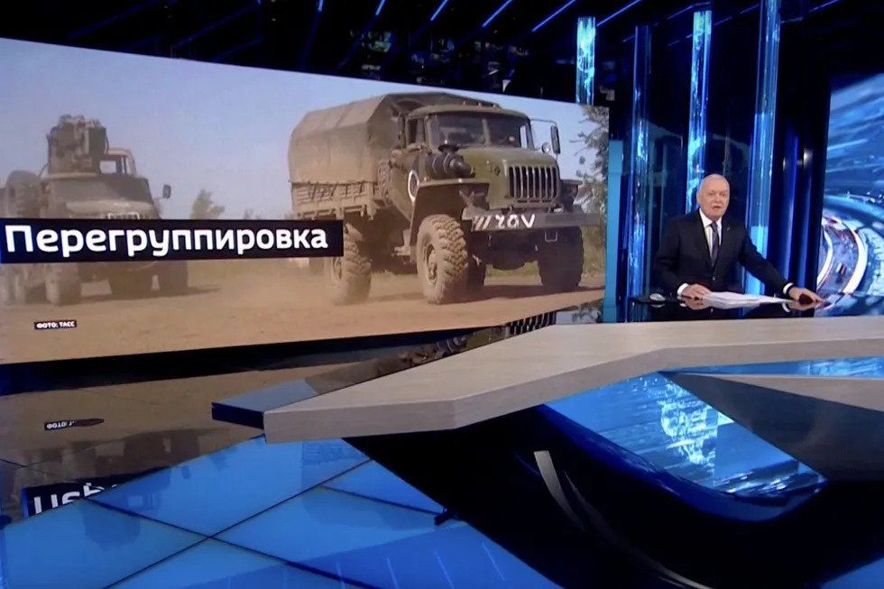 Voditeljica Weekly Reviewa Irada Zeinalova nije ulazila u detalje o povlačenju ruske vojske u nedjelju, ali je epizoda uključivala brifing za novinare Igora Konašenkova, predstavnika ruskog Ministarstva obrane. Konašenkov je najavio “operaciju ograničavanja i organiziranja prebacivanja trupa iz pravca Izjum-Balaklija kako bi se povećali napori u području Donjecka”.