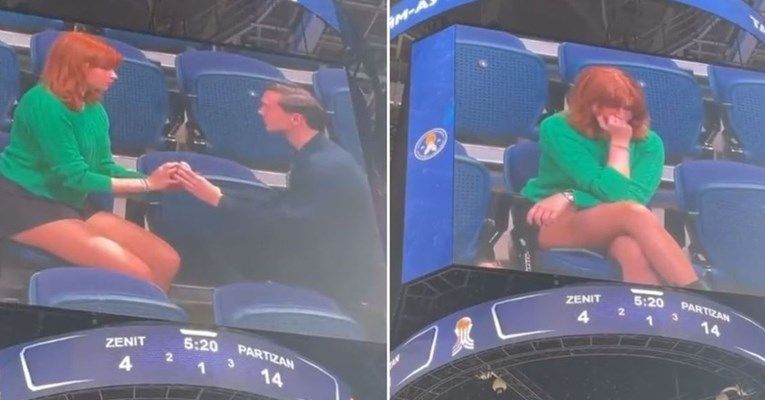 Na košarkaškoj utakmici između Zenita i Partizana u meču Superkupa VTB lige, koji se održava u Rusiji, jedan je muškarac pred očima sviju u publici odlučio na tribinama zaprositi svoju partnericu, no to nije prošlo onako kako je zamišljao.