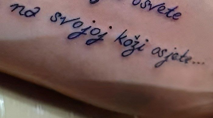 Home Mozaik Tip odlučio tetovirati stih popularne pjesme, ali nije primijetio grešku kojoj se... Mozaik Tip odlučio tetovirati stih popularne pjesme, ali nije primijetio grešku kojoj se sad svi smiju By dš - May 20, 2024 0 FacebookTwitterPinterestWhatsAppTelegram Facebook Nije da ti to zauvijek ostane na tijelu pa da treba dobro provjeriti riječi… 😀