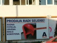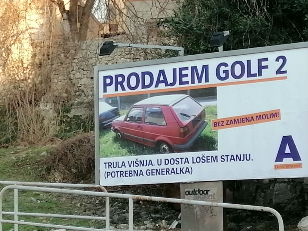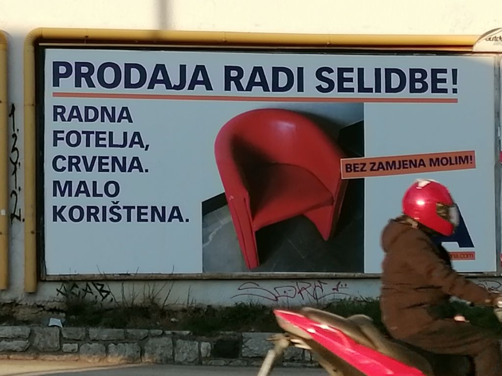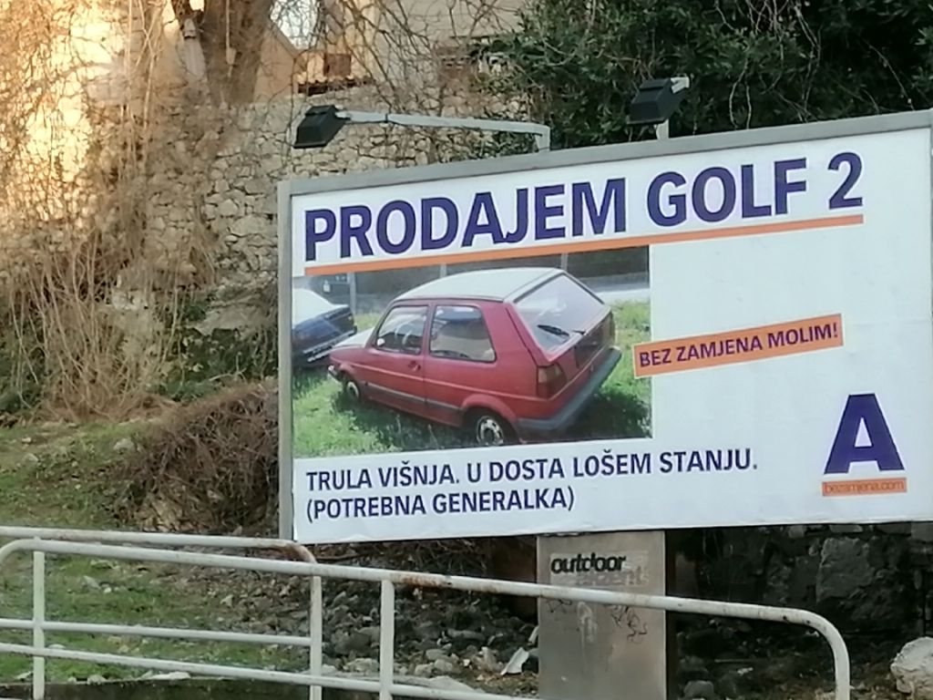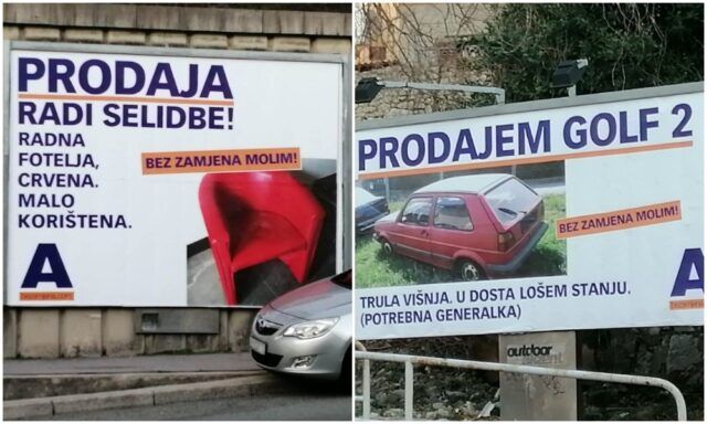 Nakon plakata ‘Rijeka zna da promjena počinje na A’, danas su se po gradu pojavili plakati – oglasi u kojima se prodaju golf 2 i crvena fotelja.