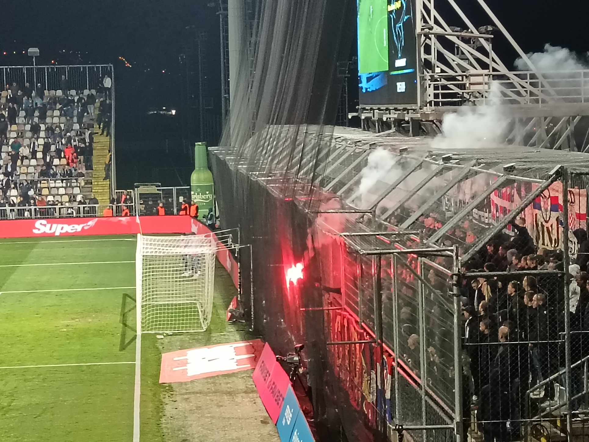 Tijekom utakmice su nekoliko puta pokušali baciti baklju u teren i zapaliti zaštitnu mrežu. Kako je to izgledalo u praksi, pogledajte u ovoj snimci