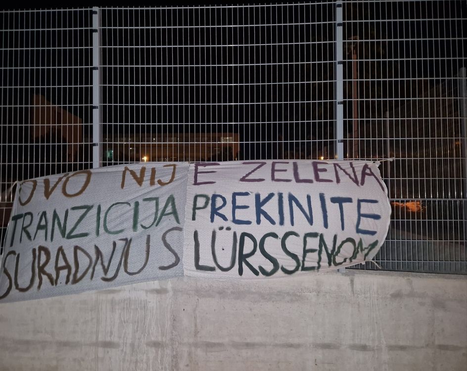 Transparent s natpisom „Ovo nije zelena tranzicija. Prekinite suradnju s Lürssenom“ postavljen je na ogradu Žilavog parka na Kampusu, što aktivisti vide kao simboličku poruku protiv koncepta zelene tranzicije koji Sveučilište promovira. Drugi transparent, „Znanje je moć koju nam ne date“, ističe osjećaj nepravde i nedostatka transparentnosti u suradnji Sveučilišta s Lürssenom, te kritizira monopol kompanije nad dijelovima grada.