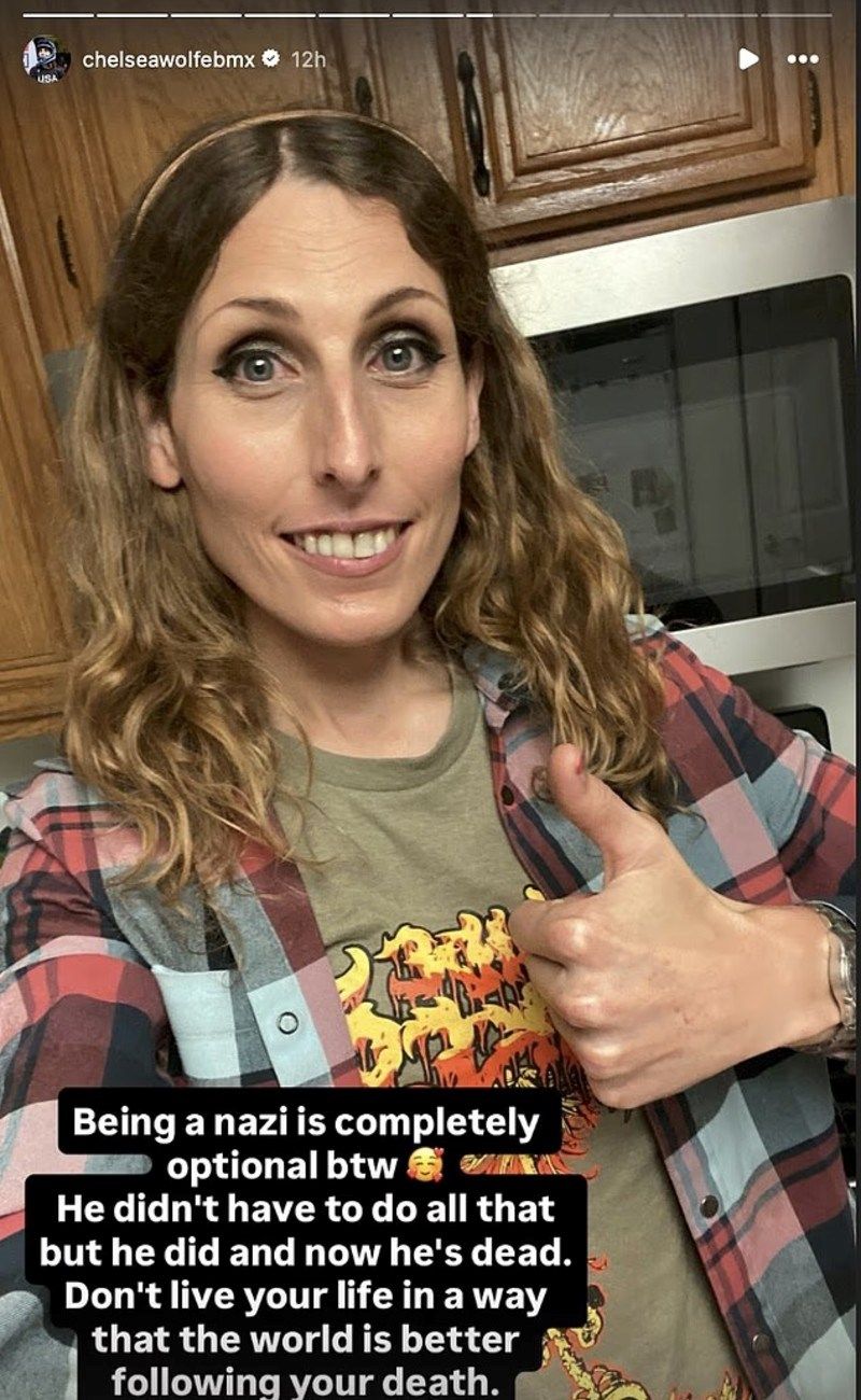 Chelsea Wolfe, američka transrodna BMX biciklistica, otvoreno je slavila smrt Charlieja Kirka na društvenim mrežama. U jednoj od objava, uz vijest o ubojstvu, postavila je animirani natpis s likom iz crtanog filma i tekstom: