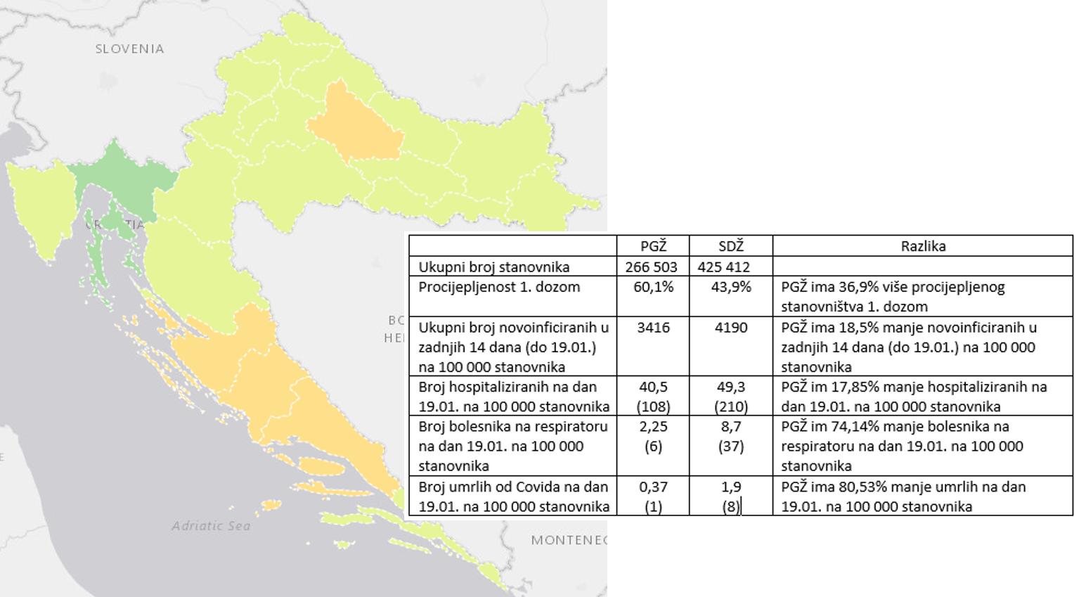 Treba usporediti stope UKUPNE SMRTNOSTI ljudi (od svih uzroka smrti) u te dvije županije da bi se dobila bolja procjena situacije “tko je bolje prošao”, a brojevi umrlih “od ili sa” Covidom mogu dati vrlo različite pa i netočne rezultate jer na njih mogu utjecati mnogi čimbenici.