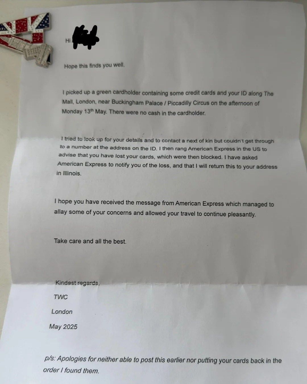 „Bok, nadam se da si dobro“, započela je osoba u pismu i objasnila kako je pronašla njegov novčanik na ulici, bez gotovine unutra. Ispričala je kako je pokušala stupiti u kontakt s nekim od njegovih bližnjih, no nije uspjela. Zatim je nazvala American Express u SAD-u kako bi blokirali kartice i informirali korisnika o gubitku.