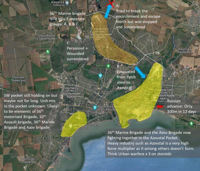 We now have a clearer picture of the situation and recent events in Mariupol. As of today there are two pockets of Ukrainian soldiers remaining. The Azovstal pocket is a fortress and could hold out as long as supplies last #UkraineRussiaWar #Mariupol #MariupolNow pic.twitter.com/ETBR6HdvuR