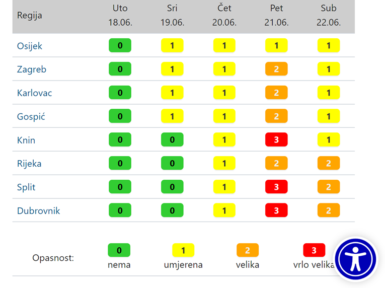 Za sutra je oglašeno umjereno upozorenje za kontinentalnu Hrvatsku, uključujući Liku. Za četvrtak, umjereno upozorenje vrijedi za cijelu zemlju. Za petak je proglašeno crveno, najviše upozorenje za širu kninsku, splitsku i dubrovačku regiju koja označava vrlo veliku opasnost od toplinskog vala. Za ostatak zemlje oglašena je velika opasnost, osim za širu osječku regiju za koju je oglašeno umjereno upozorenje.