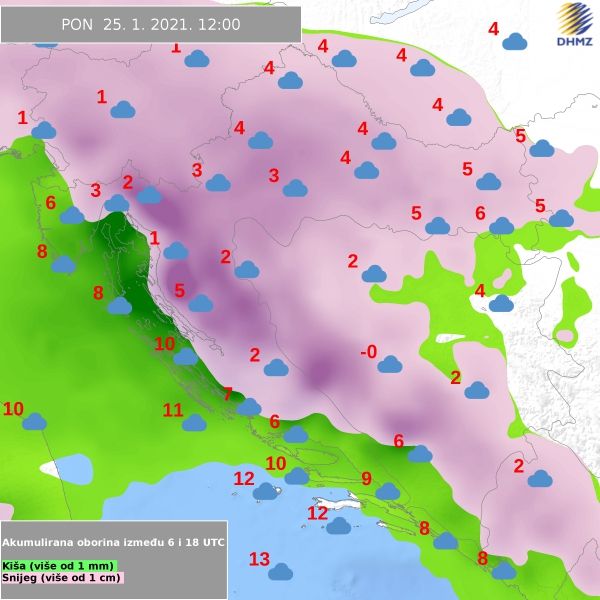 Kiša će u snijeg najprije prelaziti u Gorskom kotaru i Lici, gdje će se do kraja dana stvarati novi snježni pokrivač, moguće i deblji, uz temperaturu zraka uglavnom od 1 do 6 °C. Na sjevernom Jadranu će biti između 7 i 12 °C. Povremeno pritom kiša, mjestimice i obilnija, uz grmljavinu. Puhat će jako jugo i jugozapadnjak, prema kraju dana bura i sjeverni vjetar.