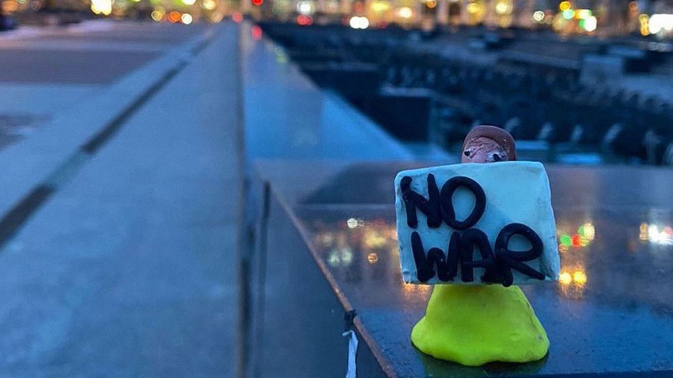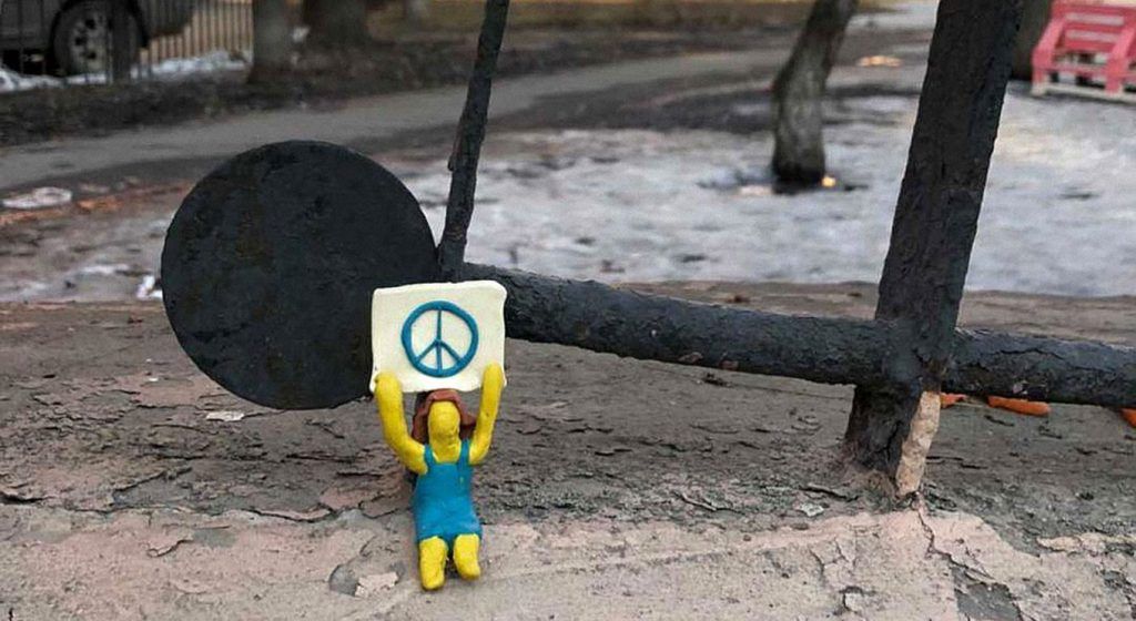 Sudionici izrađuju malene figurice od gline, papira, žice ili drugog materijala za izradu. Većina njih drži plakate protiv rata u Ukrajini.