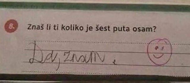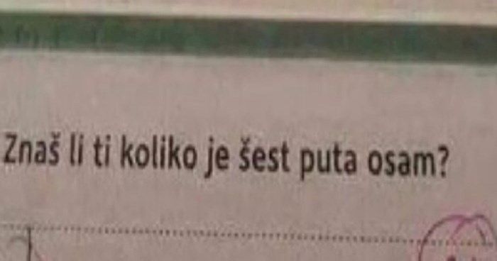 Home Mozaik Učenik napisao urnebesan odgovor u školskom zadatku i dobro zeznuo učiteljicu :-) Mozaik Učenik napisao urnebesan odgovor u školskom zadatku i dobro zeznuo učiteljicu :-) By dš - October 24, 2024 0 FacebookTwitterPinterestWhatsAppTelegram Učenik je pronašao rupu u zakonu i zapravo vrlo precizno odgovorio na pitanje. A učiteljica je dobila upravo informaciju koju je tražila u ovom nezgodno formuliranom matematičkom pitanju. 5eb362b4 1635 41b8 9389 6871d4d459bc (1)