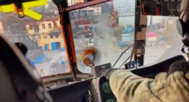 Na videosnimci se vidi kako helikopter izbjegava dizalice dok leti nisko prema čeličani.