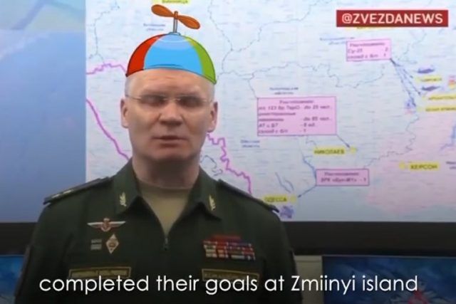 Savjetnik ukrajinskog ministra vanjskih poslova Anton Geraščenko također se narugao Rusima objavljujući video s izjavom glasnogovornika ruskog ministarstva obrane Igora Konašenkova u kojem Konašenkov ima namontiranu cirkusku kapu na glavi dok govori da se povlače kako bi pokazali dobru volju.