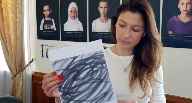 Potom je u zrak podigla crtež na kojem se nalaze crne linije. Džaparova kaže da je crtež napravio 11-godišnji dječak kojeg su ruski vojnici silovali pred majkom. Rekla je da je dječak toliko traumatiziran da od silovanja komunicira isključivo crtežima.