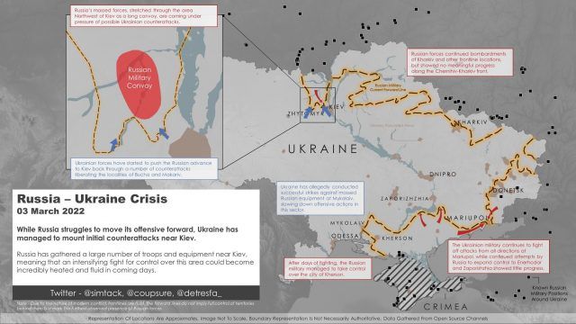 No major movement was reported today on all fronts. However, Ukraine has potentially carried out counter-attacks in areas northwest of Kyiv.