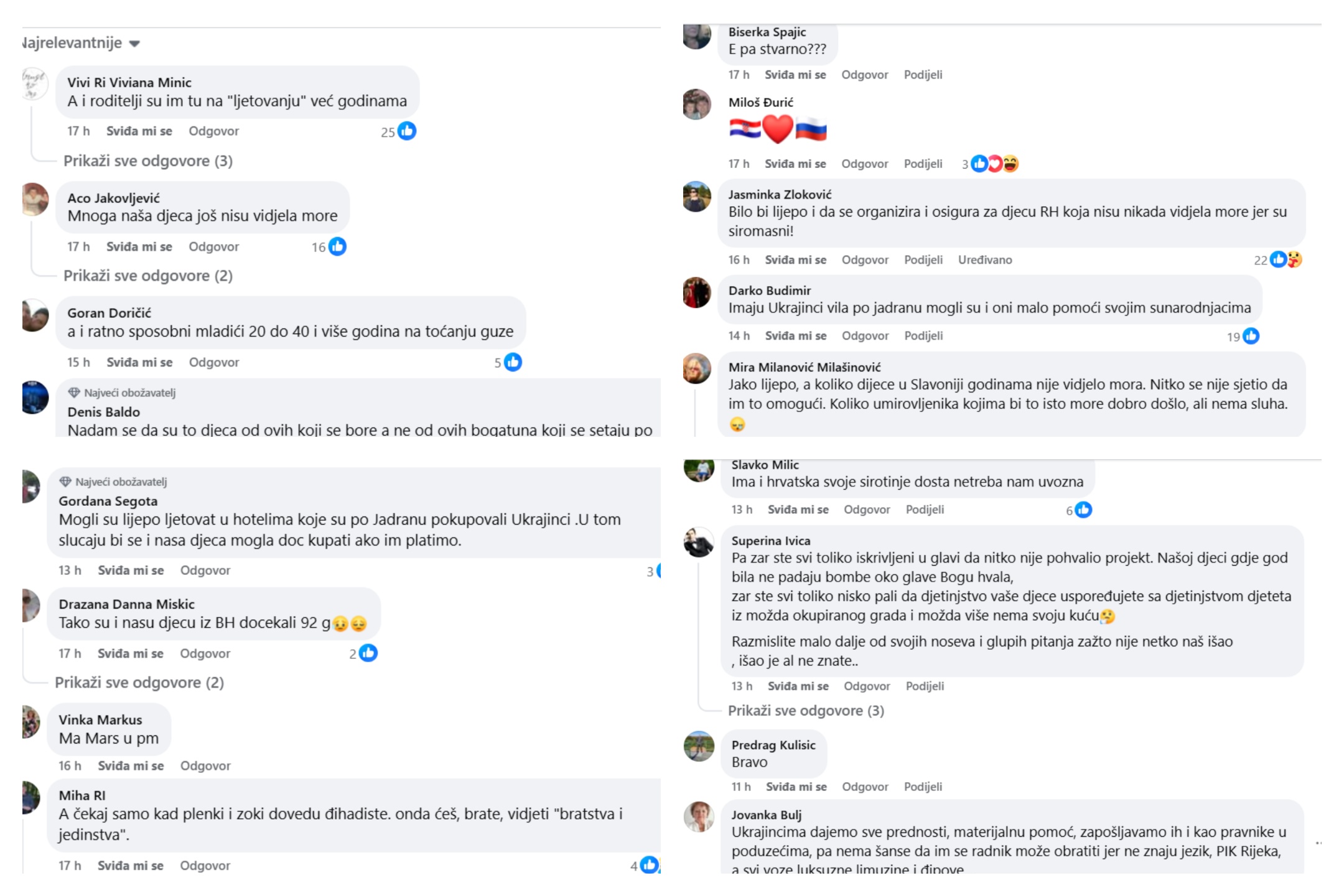 - „Mnoga naša djeca još nisu vidjela more“ – poručio je jedan komentator, implicirajući da tuđa djeca ne zaslužuju predah od rata jer hrvatska djeca imaju drugih problema.