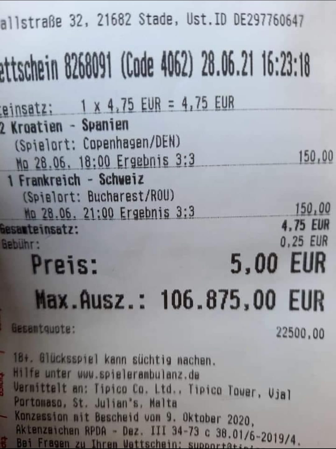 Jučerašnji dan posebno će pamtiti jedan kladioničar koji je na pet uplaćenih eura (37 kuna) dobio više od 106 tisuća (oko 800 tisuća kuna). U obje utakmice je pogodio točan rezultat u regularnih 90 minuta. Koeficijent da će susreti Hrvatska – Španjolska i Francuska – Švicarska završiti rezultatom 3:3 bili su po 150.