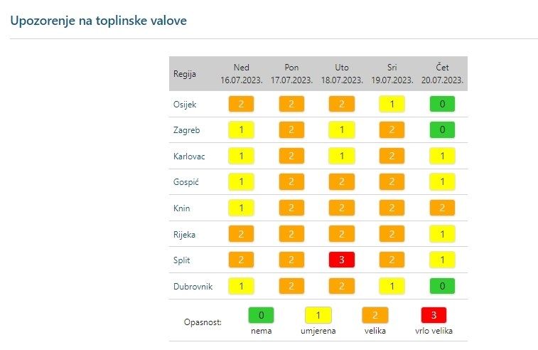 Za splitsku, riječku i osječku regiju danas je na snazi narančasto upozorenje, koje znači veliku opasnost, a za sutra je ono izdano za cijelu zemlju. Idući tjedan očekuju su temperature i do 40°C. Toplinski val trajat će do četvrtka, a za srijedu je za splitsku regiju izdan crveni alarm.