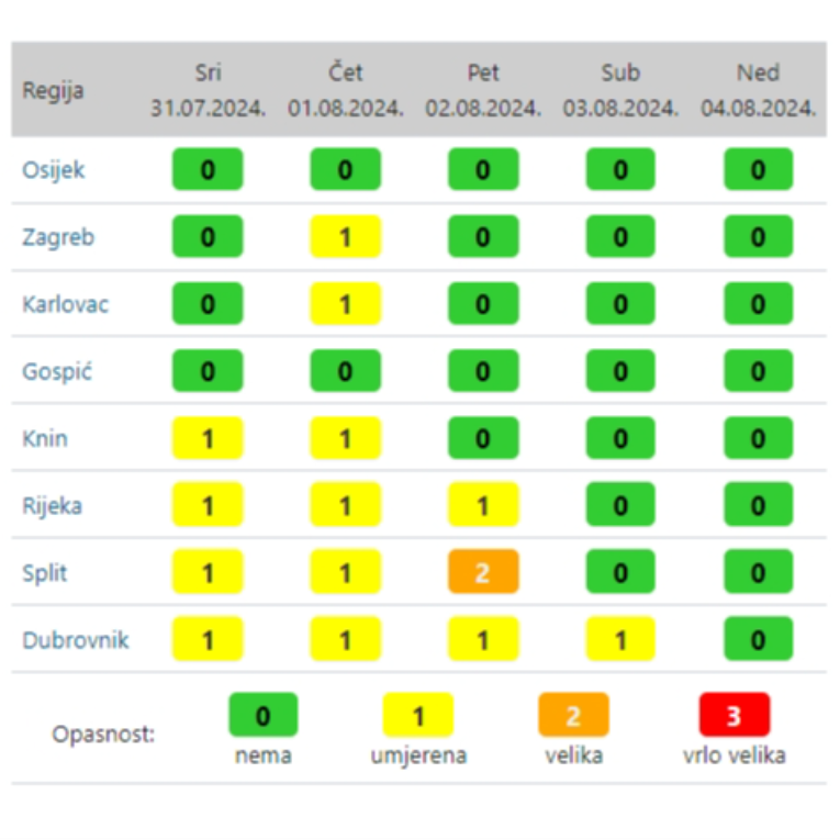 Danas je na snazi žuto upozorenje zbog mogućih grmljavinskih nevremena za četiri regije: zagrebačku, karlovačku, riječku i gospićku. Također, na kninskom, riječkom, splitskom, dubrovačkom, karlovačkom i zagrebačkom području i dalje je na snazi žuto upozorenje na toplinski val.