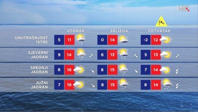 I na Jadranu će u utorak te osobito srijedu biti mjestimične kiše, osobito na sjevernom dijelu, dok će se u utorak u Dalmaciji još zadržati suho i pretežno sunčano. Od četvrtka ponovno manje oblaka, u početku i jaka bura s kojom će osvježiti, a zatim porast temperature, prognozirala je za HRT dr. sc. Tanja Renko iz DHMZ-a.