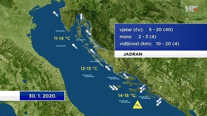 Na jugu Hrvatske će jugo zapuhati tek navečer, a do tada će biti bure i tramontane, još i prijepodne ponegdje jake, stoga i valovitog mora. Uz pretežno sunčano vrijeme temperatura zraka će od jutarnjih 6 do 8°C, u unutrašnjosti i samo oko 0°C, poslijepodne biti od 12 do 15°C.