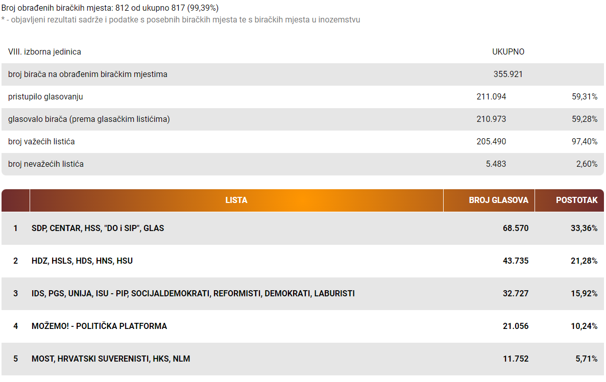 Iz 8. izborne jedinice tako u Sabor ide 6 zastupnika sa SDP-ove liste, 4 je dobio HDZ, 2 IDS te po jedan Most i Možemo.