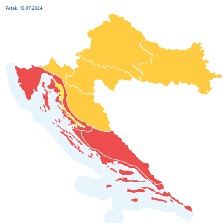 Danas je na kopnu na snazi narančasto upozorenje zbog visokih temperatura, dok je u Dalmaciji na snazi crveno upozorenje. Danas se očekuje pretežno sunčano i vruće vrijeme s maksimalnim temperaturama između 31 i 36°C, dok u Dalmaciji temperature mogu biti i malo više. Međutim, uz lokalno jak razvoj oblaka, u unutrašnjosti su mogući izraženiji pljuskovi s grmljavinom.