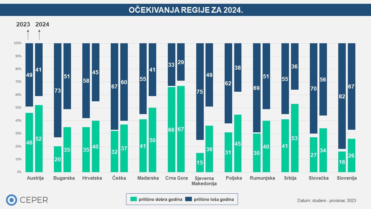 Unatoč prethodnim razočaranjima, 2024. godina dočekana je s blagim optimizmom u nekim srednjoeuropskim zemljama. Austrija, Mađarska, Crna Gora i Srbija većinom vjeruju da će godina biti dobra za njihovu zemlju. Ipak, Hrvatska zadržava pesimističan pogled, s 45% ispitanika koji očekuju da će i 2024. biti prilično loša godina.