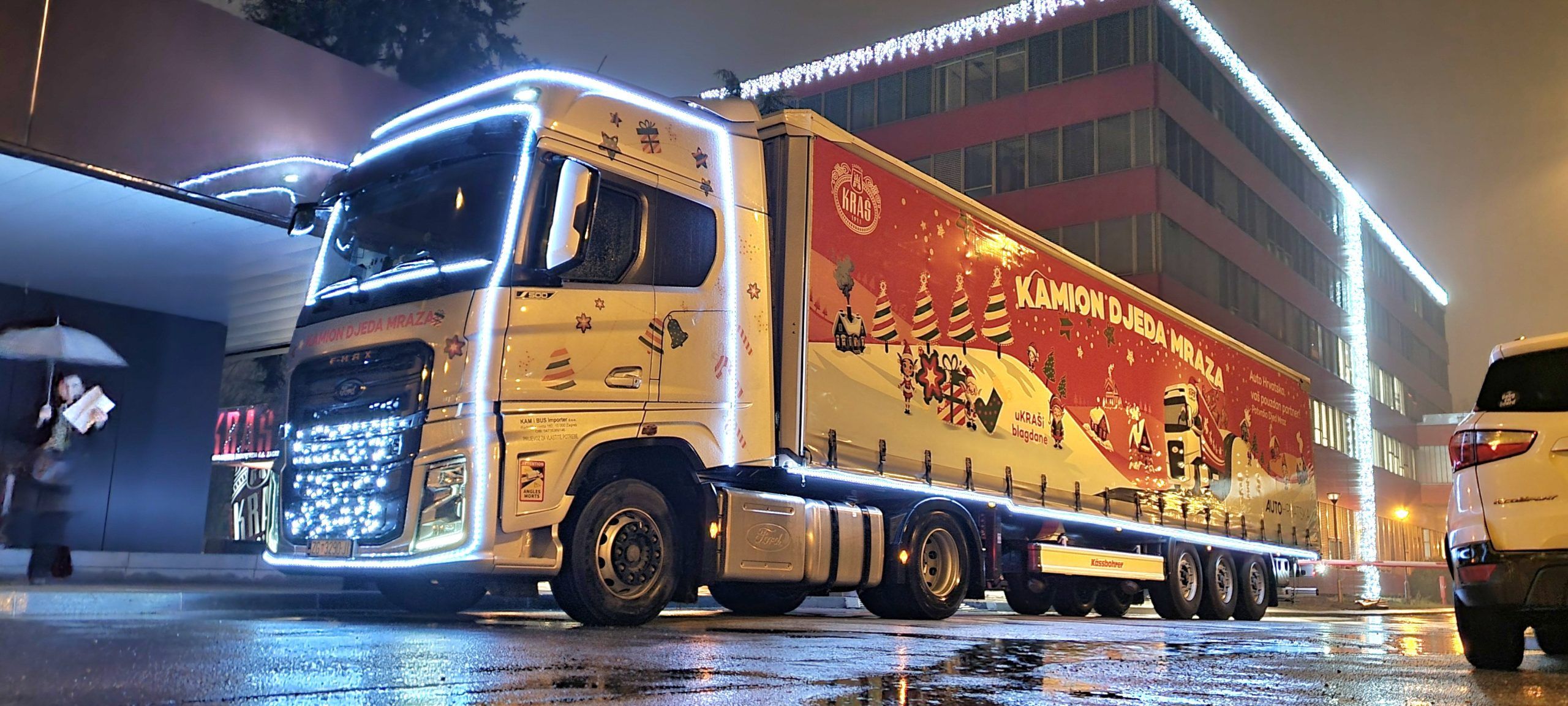 Ovogodišnje saonice Djeda Mraza je zamijenio kamion F-MAX marke Ford Trucks koji vuče poluprikolicu Kässbohrer s putujućom pozornicom.