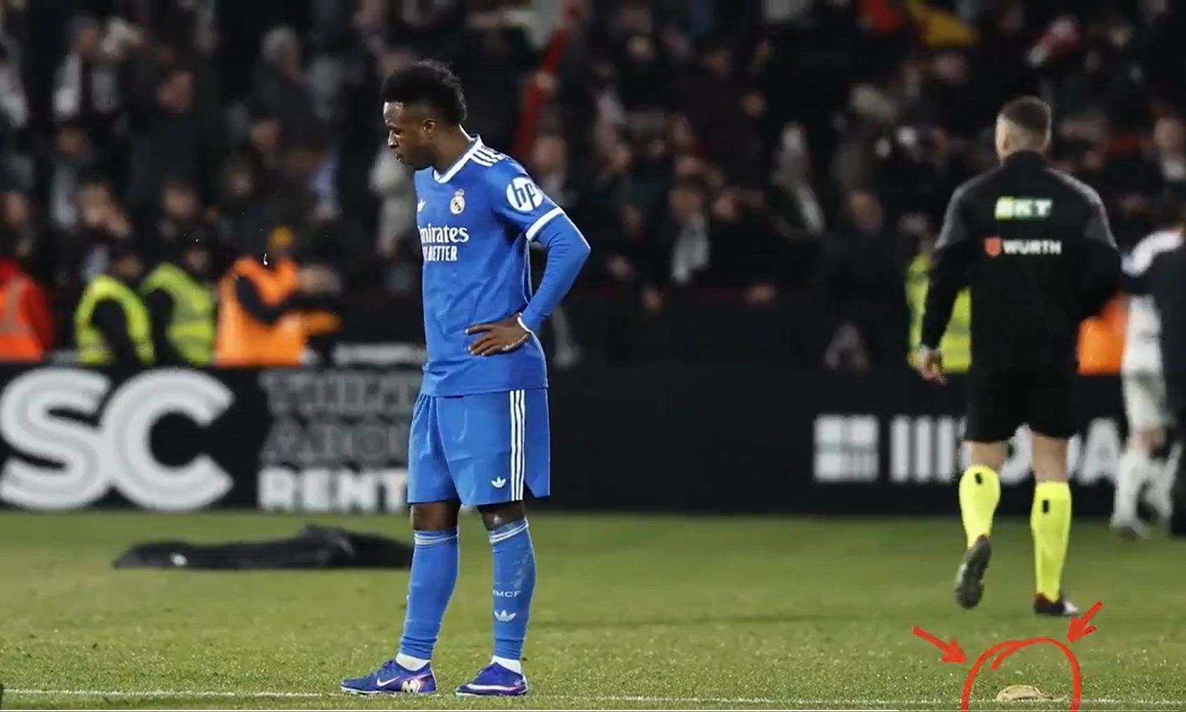 Tijekom proslave trećeg gola domaćina, jedan navijač s tribina bacio je koru banane prema brazilskom napadaču Vinícius Júnior, koja ga je zamalo pogodila. Kora je ubrzo uklonjena s travnjaka. Fotografije koje je zabilježio reporter AS-a pogledajte OVDJE.