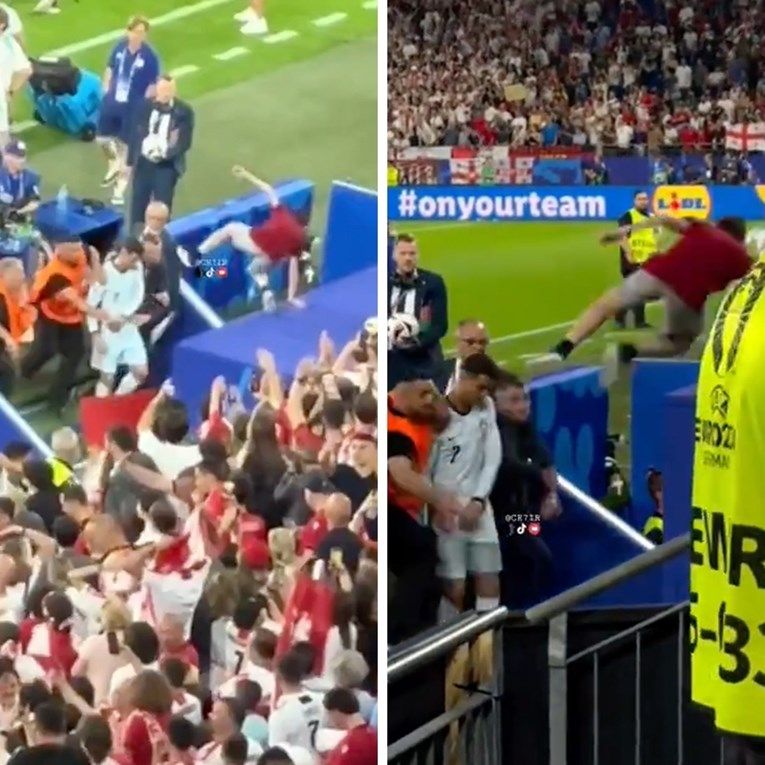Strašna scena nakon utakmice Portugal – Gruzija (0:2) u zadnjem kolu skupine Eura. Dok je Cristiano Ronaldo izlazio s terena u tunel stadiona u Gelsenkirchenu, njemu je pred noge s tribina doslovno doletio navijač. Izvjestitelji s Eura javljaju da je to Ronaldov fan, koji je u očajničkom pokušaju da dođe što bliže idolu izveo opasnu ludost.