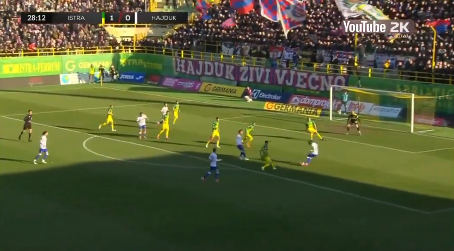 Bamba zabija za izjednačenje u Puli protiv Istre. Marko Livaja primio je loptu okrenut leđima prema golu je je gurnuo prema Bambi, koji je sjajno zabio lijevom nogom od dalje stative. Pitanje ostaje je li bilo zaleđe.