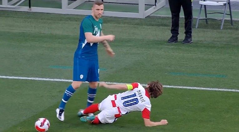 U jednom duelu s Jasminom Kurtićem u 11. minuti Luka Modrić izgubio je živce i nervozno je reagirao. Kurtić mu je s leđa pokušao oduzeti loptu i udario ga po nozi jer nije uspio doći do nje. No Modrić mu nije ostao dužan. S trave je udario igrača Slovenije koji se srušio.