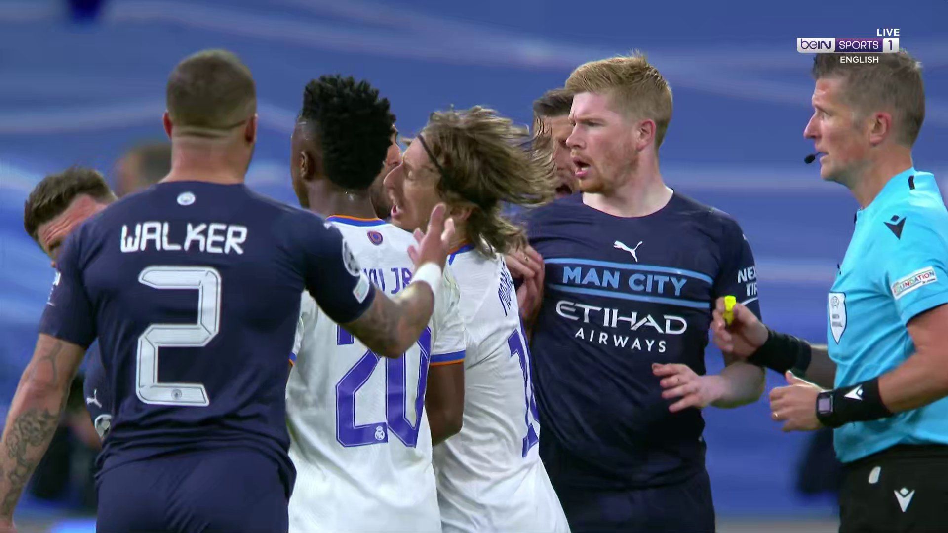 U 9. minuti požutili su i Laporte i Modrić. Laporte je bio nešto žešći, ošamario je Modrića, a kada mu je Modrić uzvratio i odgurnuo ga, nogometaš Cityja pao je na pod.