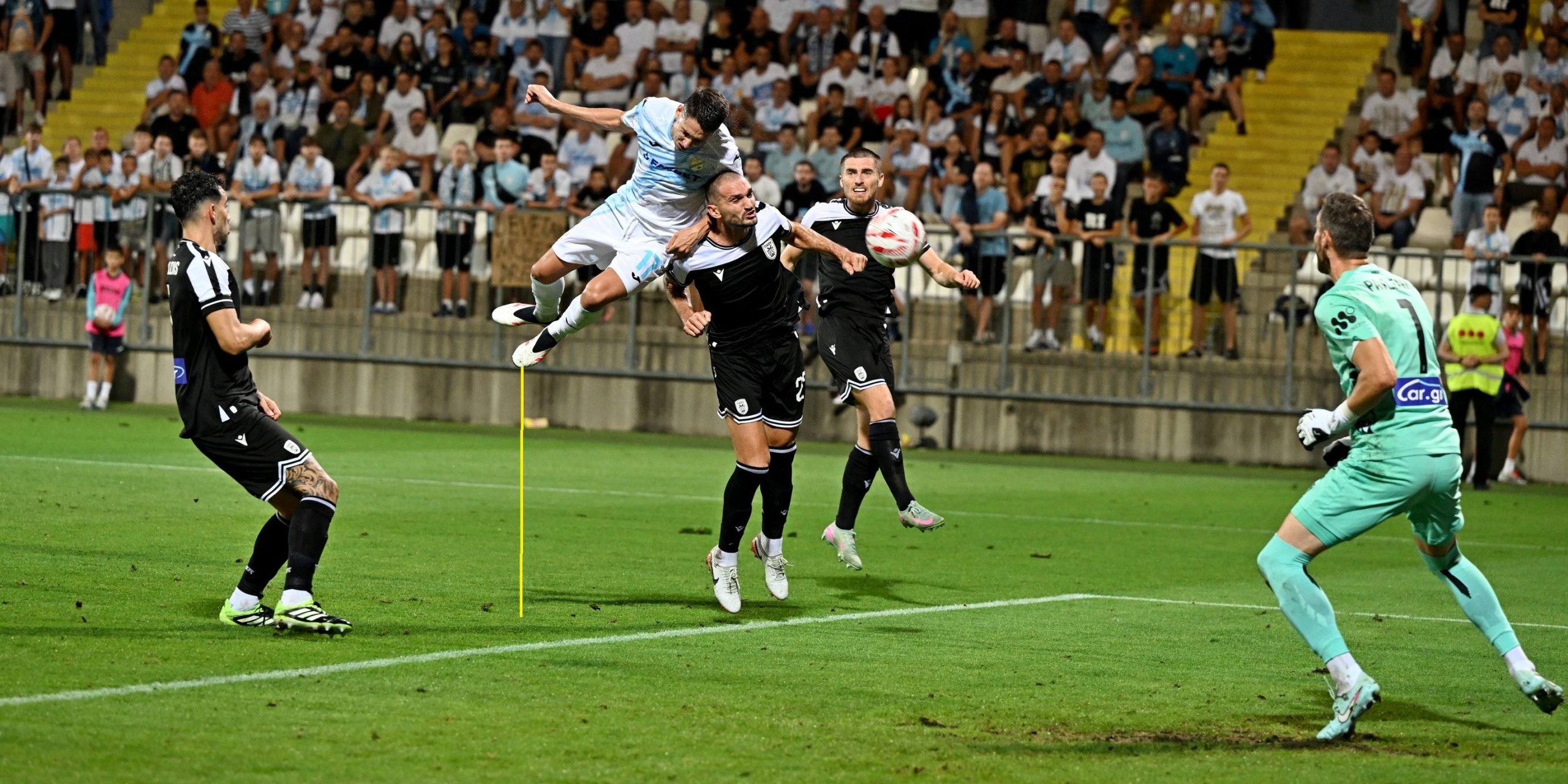 Niko Janković ubacio je iz slobodnog udarca, a Menalo je na drugoj vratnici spektakularnim skokom nadskočio braniča i glavom poslao loptu u mrežu. Taj trenutak izazvao je erupciju oduševljenja na tribinama i donio Riječanima vrijednu prednost pred uzvrat u Solunu.