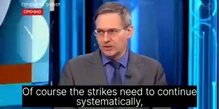 Snimka koju je na Twitteru podijelio BBC-jev novinar Francis Scarr prokazuje kako Aleksandar Artamonov u eteru ruske državne televizije govori kako se “udari moraju sustavno nastaviti” nakon jutrošnjeg napada.