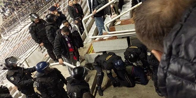 Nakon što su navijači utrčali u teren, poljudskim tribinama proširio se nemir. Policija ga je odlučila ugušiti u samom začetku – palicama i lisicama.