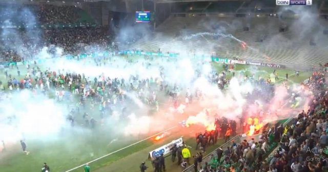 Navijači St. Etiennea se nisu mogli pomiriti s odlaskom u niži rang pa su nakon zadnjeg penala probili osiguranje i utrčali na teren i krenuli divljati. Napadali su sve pred sobom, a bakljama su zasuli i svečanu ložu i tunel za igrače, dok su pred njima bježali prestravljeni igrači i osoblje klubova, ali i redari od kojih su neki i ozlijeđeni.