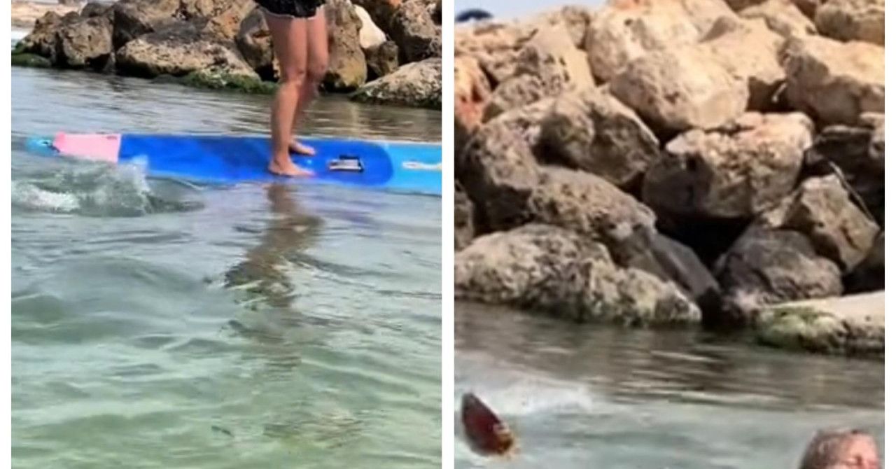 Na snimci se vidi kako je morski pas privučen dasci za surfanje koja mu je bila blizu, a kao što je poznato, morski životinje često izazivaju znatiželju prema neobičnim predmetima u svom okruženju. Međutim, ovaj susret nije završio onako kako bi se očekivalo. U jednom trenutku, surferica koja je stajala na dasci izgubila je ravnotežu i pala direktno na morskog psa koji je bio tik do nje.