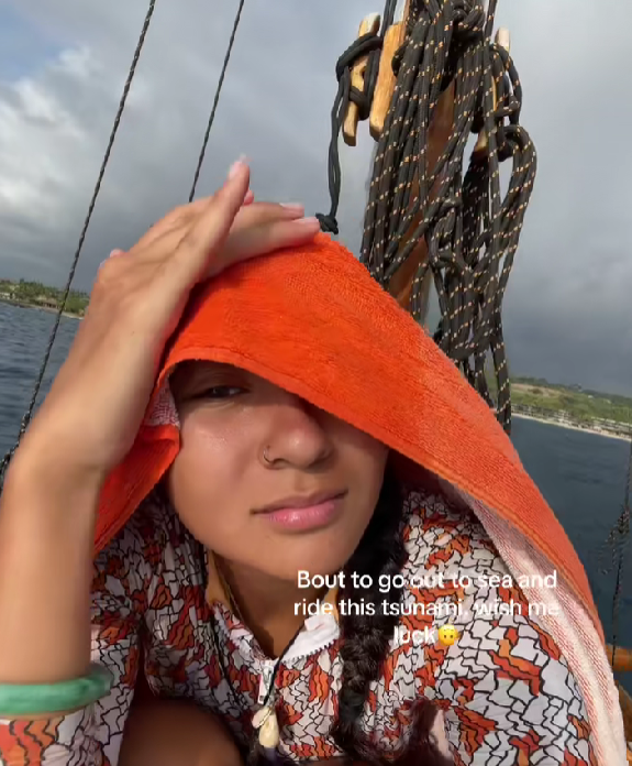 TikTokerica Tehani (@teh_aloha) snimila je video u kojem se doslovno pluta na splavi usred oceana dok se približava tsunami. U pozadini videa svira vesela pjesma, a ona piše: “Spremam se izaći na more i jahati ovaj tsunami, poželite mi sreću.”