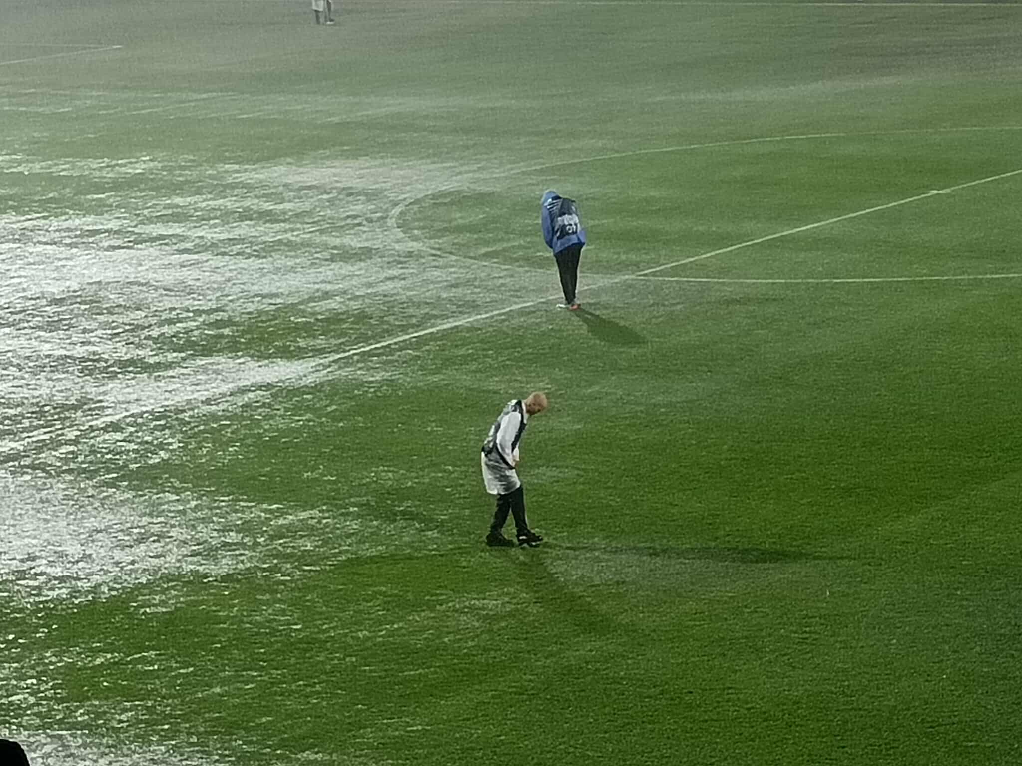 Kako je kiša nastavila padati, teren je postao gotovo neupotrebljiv. U 13. minuti glavni sudac Robert Jones odlučio je privremeno zaustaviti utakmicu. Pozvao je kapetane obje momčadi na razgovor o mogućem prekidu susreta, s obzirom na to da su uvjeti na Rujevici postali gotovo nemogući za igru.