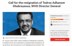 Internetska peticija kojom se traži ostavka predsjednika Svjetske zdravstvene organizacije dr. Tedrosa Adhanoma Ghebreyesusa dobila je više od milijun potpisa.