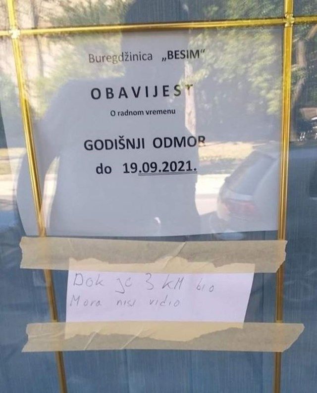 Viralna fotka stiže iz Ljubuškog gdje je vlasnik jedne buregdžinice obavijestio svoje vjerne klijente kako će do 19.9. objekt biti zatvoren zbog godišnjeg odmora.