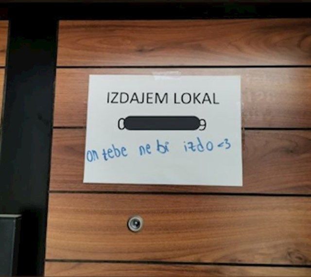 Vlasnik jednog lokala u BiH odlučio je obavijestiti svoje sugrađane o promjeni na vratima lokala. Na papiru jednostavno piše kako se lokal daje u najam. No, situaciju je začinio slučajni prolaznik ili možda stalni gost kojem je očito zasmetalo što lokal više ne radi. Taj kreativni pojedinac nije mogao odoljeti da nešto ne dopiše na ovu obavijest.