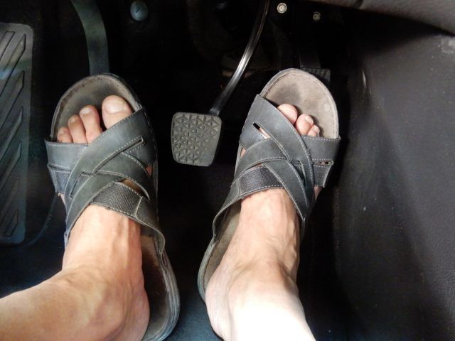 Nije uputno voziti ni bos, premda je to znatno manje štetno i potencijalno opasno. Naime, najveći problem je u radnji skidanja noge s gasa i potom pritiskanju kočnice. Vozač/vozačica rutinski, kao cjelinu, rade tri slijedna pokreta: podižu je s gasa, pomiču ulijevo i pritišću kočnicu.