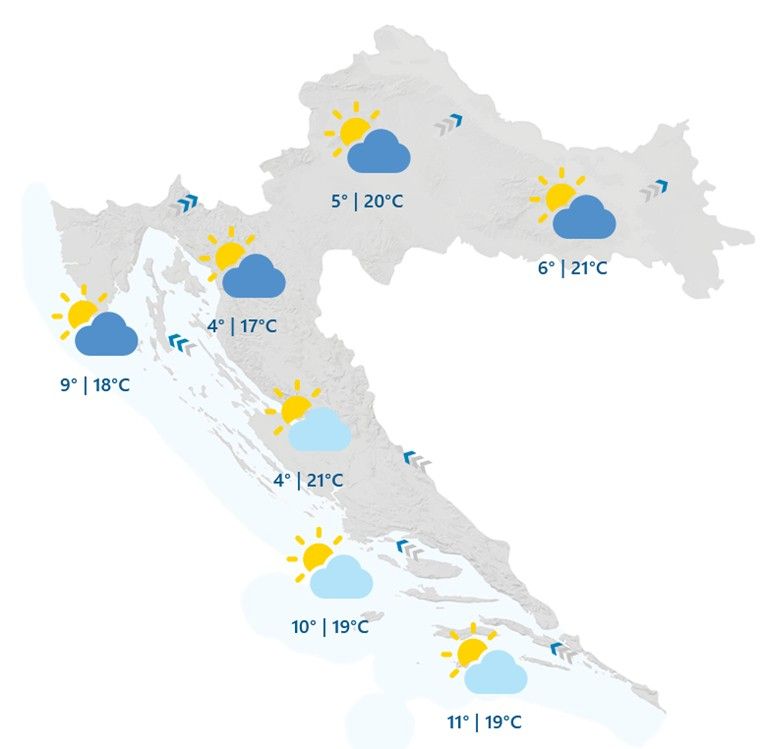 Temperature zraka bit će u ugodnom rasponu s najvišim dnevnim vrijednostima između 15 i 20 °C. Vjetar će uglavnom biti slab, s povremenim umjerenim sjeverozapadnim i sjeveroistočnim udarima. Na Jadranu će jutarnje sate obilježiti bura, koja će biti jaka, a tijekom dana očekuje se smirivanje bure i prelazak na sjeverozapadnjak i jugozapadnjak.