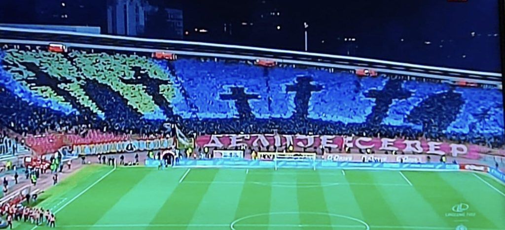 Crvena zvezda je u derbiju srpskog nogometa s 2:0 pobijedila vodeći Partizan i primaknula mu se na samo dva boda. Zanimljivo je bilo i na tribinama u Beogradu. Navijači Zvezde su uoči početka susreta priredili koreografiju preko cijele tribine u bojama ukrajinske zastave na kojoj je groblje. Zatim je podignuta tzv. šetalica na kojoj je bio lik starca iz kultnog filma Maratonci trče počasni krug.