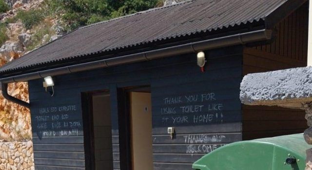 Sanitarni čvor je izveden kao drvena baraka na kojoj je kredom napisano: “Hvala što koristite toalet kao kod svoje kuće ili doma unaprijed hvala!!!”